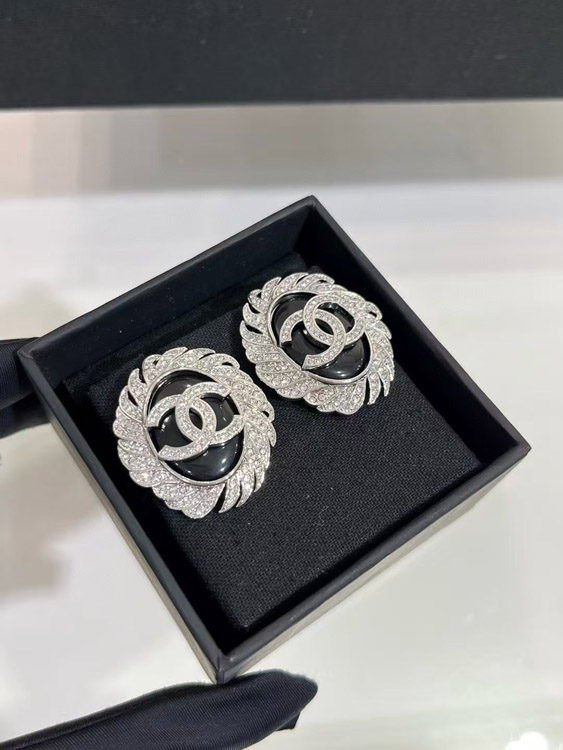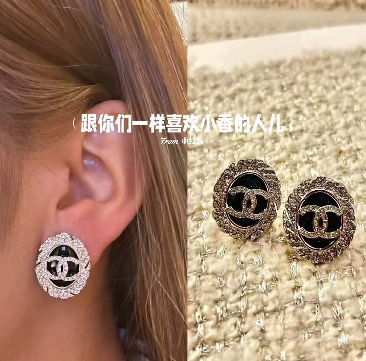 Celine black oval button silver full diamond double C earrings-3900