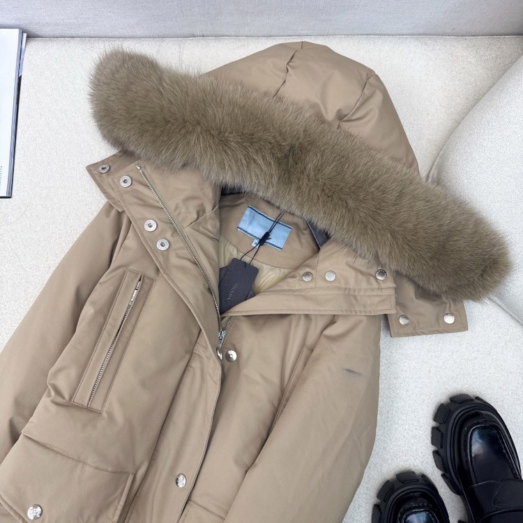 Prada thick down coat with large fox fur collar and fitted waist-5352